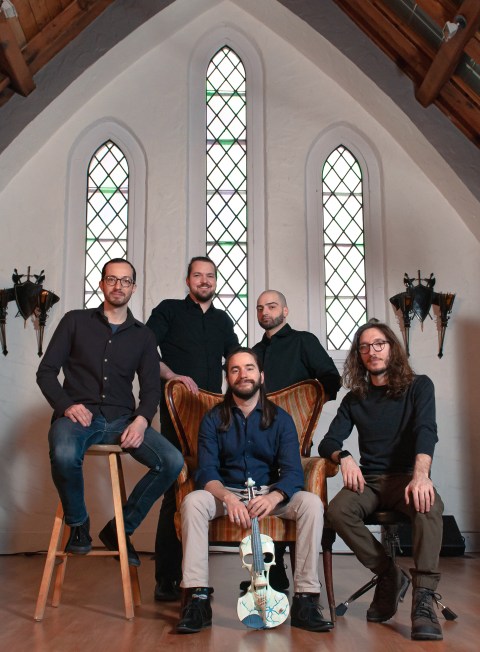 L-R – Camille Delage (piano and keyboards), Kevin Paquet (guitars), Olivier Allard (Violin), Nico Damoulianos (Bass), Alexandre Dagenais (Drummer)