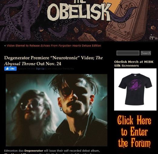 “The cut “Neurotonic” culled from the first half of The Abyssal Throne is likewise atmospheric and catchy. In some of its harder moments, there’s a sense of Degenerator The Abyssal Thronemetallic emotionalism that reminds of Katatonia, but by and large Degenerator — that’s vocalist, guitarist and bassist Barrett Klesko and drummer Jonathan Webster — keep the vibe geared toward a heavy alternative rock, not quite stoner or even prog-stoner, but certainly aware of and wiling to be led by its riff, and the melody of the vocals in hook digs into pop hookmaking without sounding ridiculous, and that’s something of a triumph itself. In combination with the sharper-edged “Eternalism,” the album-opener and prior single, it portrays the band as experienced songwriters at the relative outset of developing an already-broad sound.” – The Obelisk