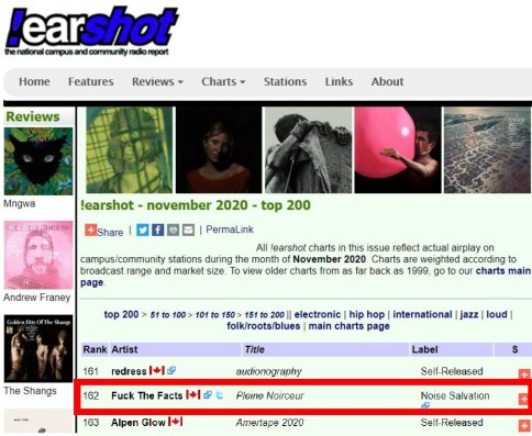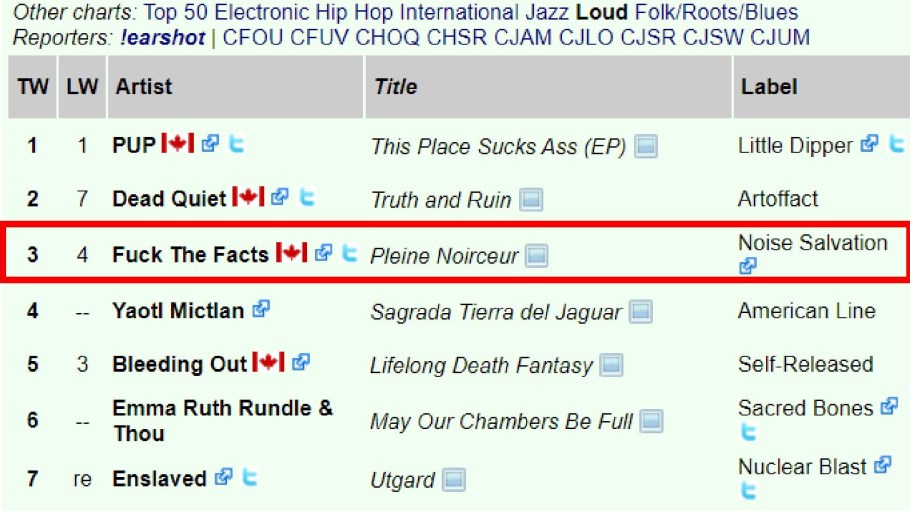 0 Hail Horns! Thank You Canadian MDs and DJs #3 Fuck The Facts – Pleine Noirceur (Noise Salvation) !earshot – The National Loud Chart For the Week Ending: Tuesday, November 24, 2020