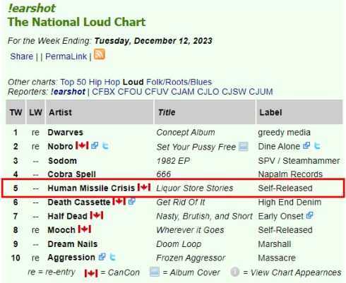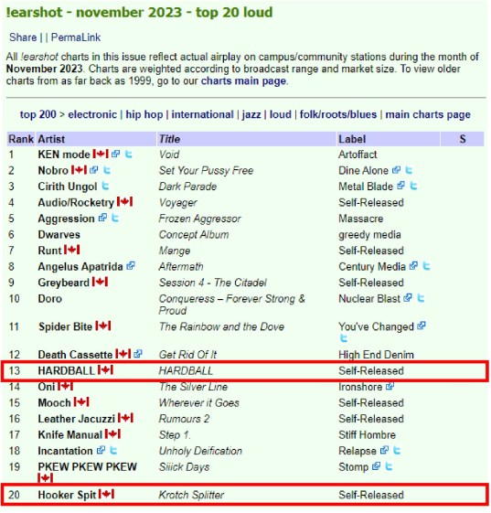 0 Hails Horns! \m/\m/ Thank You Canadian MDs and DJs for the airplay love! earshot – November 2023 -Top 20 loud #13 – HARDBALL, #20 Hooker Spit === !earshot – The National Loud Chart For the Week Ending: Tuesday, December 12, 2023 #5 Human Missile Crisis