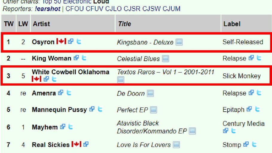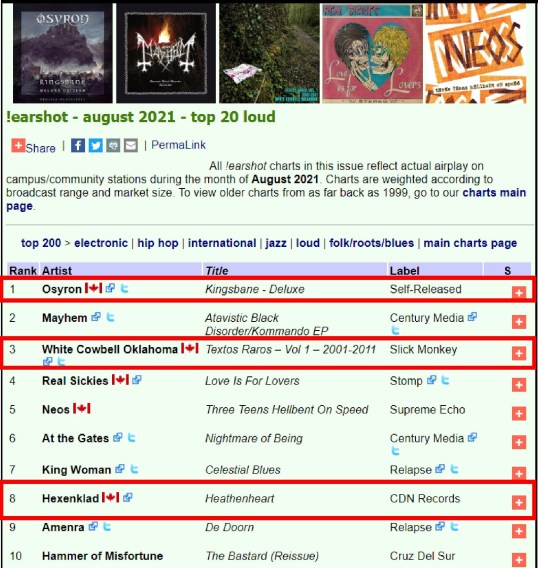 0 Huge Hails Horns! \m/\m/ Thank You Canadian MDs and DJs! !earshot – The National Loud Chart #1 Osyron, #3 White Cowbell Oklahoma, #9 Hexenklad – CDN Records For the Week Ending: Tuesday, August 24, 2021