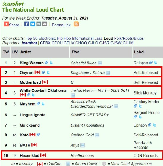 0 HUGE HAILS HORNS! \m/\m/\m/\m/ Thank You Canadian MDs and DJs so much for the airplay love! !earshot – The National Loud Chart #2 Osyron, #3 Mütherload, #4 White Cowbell Oklahoma, #10 Hexenklad – CDN Records For the Week Ending: Tuesday, August 31, 2021