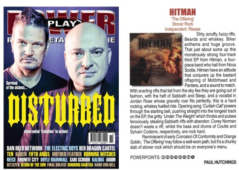 0 November 2018 – Powerplay Mag UK – Hitman “Dirty, scruffy, fuzzy riffs. Beards and whiskey. Biker anthems and huge groove. That just about sums up this monstrously strong four-track third EP from Hitman, a four-piece band who hail from Nova Scotia….it’s a chunky slab of stoner rock which should be on everyone’s menu.”