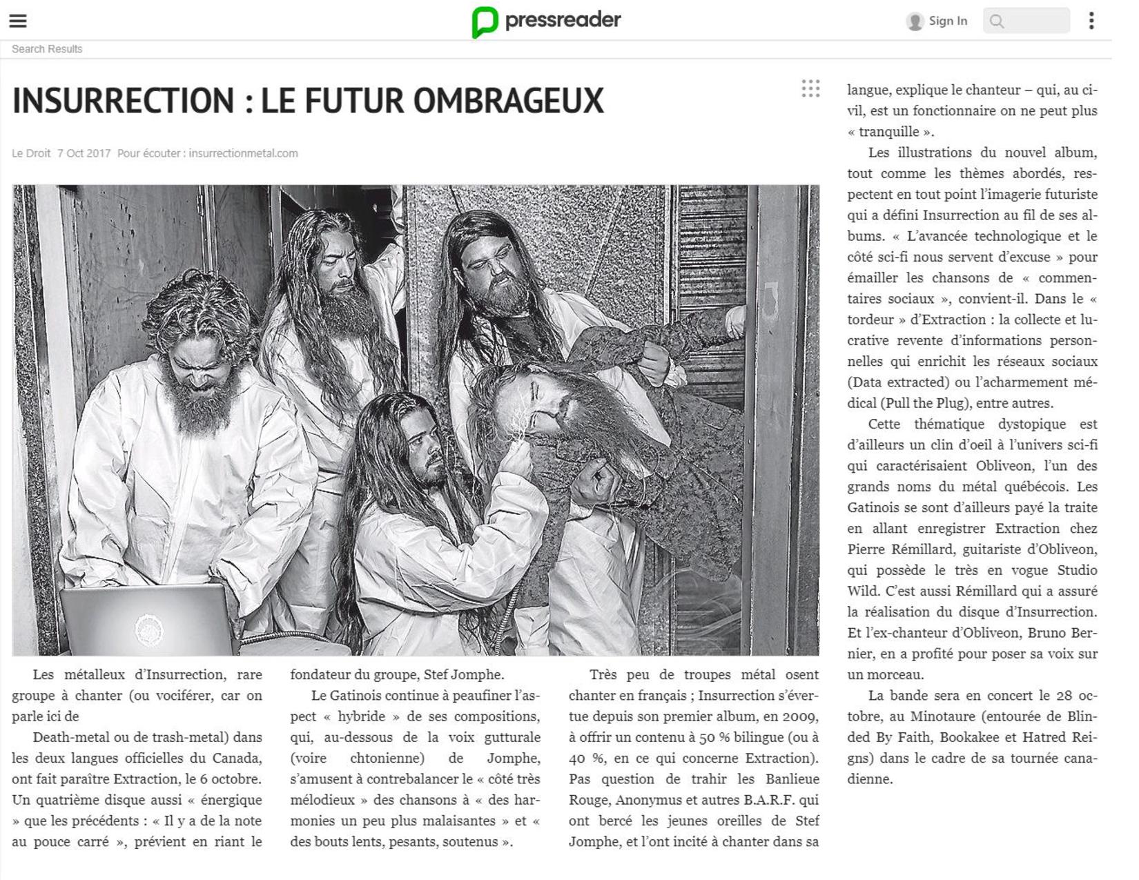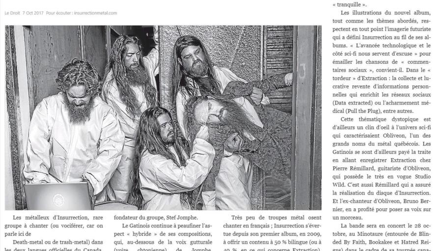 Pushing development to blasphemous levels and quickly spreading their notoriety to areas of Quebec and Ontario. INSURRECTION continues to expand and modulate to corrupt the entire East coast of Canada returning with their new album “Extraction”. A ten track aberration, ready to shock and blast fans to the next life, the album is produced by Pierre Rémillard at Wild Studio (Cryptopsy, Obliveon, Anonymus, Voivod, Krisiun, Ghoulunatics, Despised Icon, Beneath the Massacre, Gorguts, Martyr, etc) and features guest vocals from Bruno Bernier (Obliveon) on “Data Extracted … End Transmission”. The album is slated for release on October 6, 2017 via Galy Records.