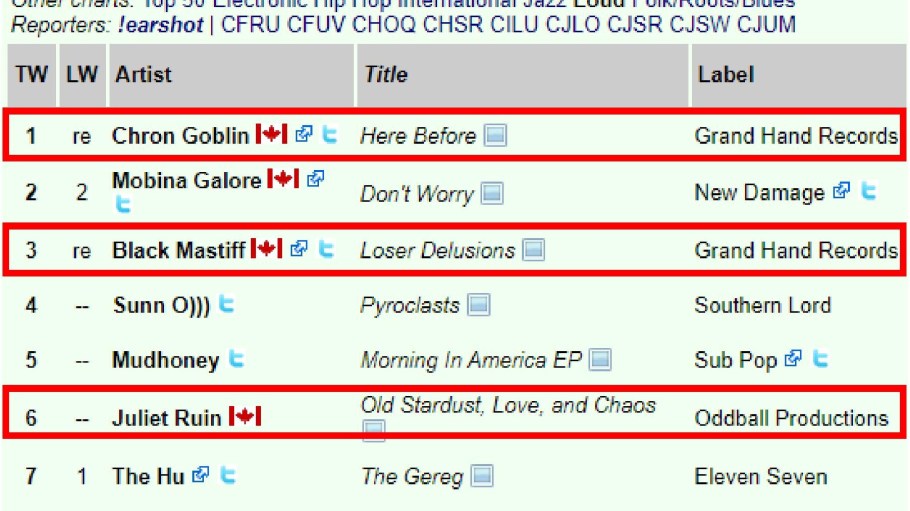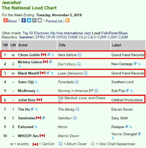0 Slaying the charts! Thank you DJs and MDs! \m/\m/ #1 Chron Goblin #3 Black Mastiff #6 Juliet Ruin !earshot – The National Loud Chart For the Week Ending: Tuesday, November 5, 2019