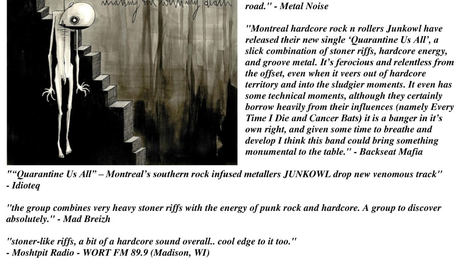 “Montreal hardcore rock n rollers Junkowl have released their new single ‘Quarantine Us All’, a slick combination of stoner riffs, hardcore energy, and groove metal. It’s ferocious and relentless from the offset, even when it veers out of hardcore territory and into the sludgier moments. It even has some technical moments, although they certainly borrow heavily from their influences (namely Every Time I Die and Cancer Bats) it is a banger in it’s own right, and given some time to breathe and develop I think this band could bring something monumental to the table.” – Backseat Mafia“