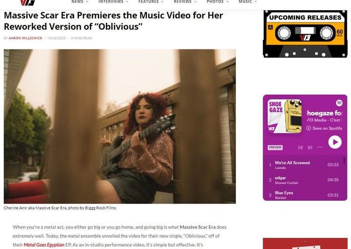 ” When you’re a metal act, you either go big or you go home, and going big is what Massive Scar Era does extremely well. Today, the metal ensemble unveiled the video for their new single, “Oblivious,” off of their Metal Goes Egyptian EP. As an in-studio performance video, it’s simple but effective. It’s particularly effective due to the level of precision with which the band plays. Then you add in the orchestral elements, and you have essentially what amounts to a symphony. Beyond band founder and leader Cherine Amr, there are many minds and parties at play to bring this vision to life. Amr collaborates closely with musicians, producers, and video creators. Her goal is to combine heavy metal’s power with traditional Arabic music’s beauty and charisma. You’ll hear it all come together in perfect harmony upon Metal Goes Egyptian’s official release on November 3rd.” – V13 (2023 – Metal Goes Egyptian)