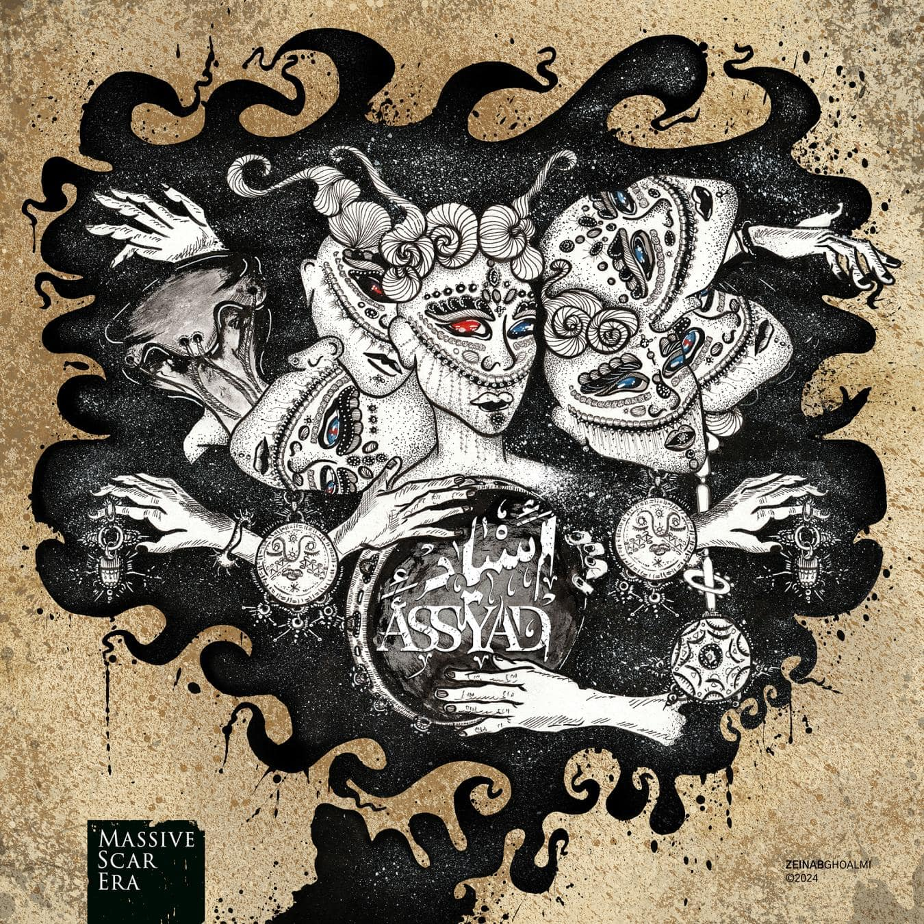 I discovered Zeinab on Behance and was captivated by her unique, obscure art. Given her cultural background of being also from the Arabic-speaking region, I knew she would easily get the cultural nuances and mostly understand the Arabic lyrics on Assyad. I shared the EP and some jewelry related to Zar rituals with her. Although these elements aren’t directly reflected in the artwork, her inspiration is subtly evident. Zeinab truly grasped the essence of the project and created a vision for *Assyad* that fits perfectly.