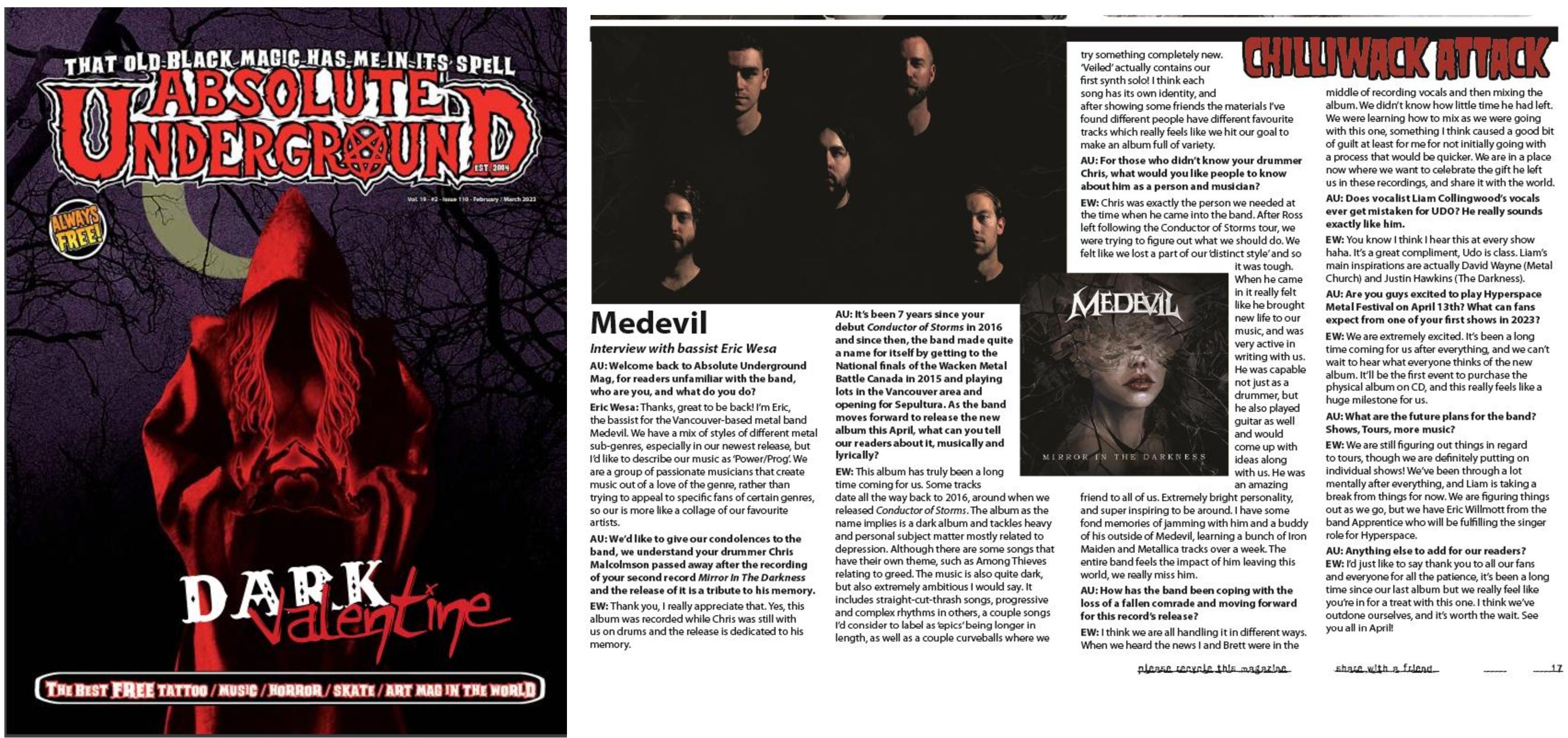 Now in 2023, Medevil is gearing up to release their second album “Mirror in the Darkness” in April and they couldn’t be more pleased to show off their updated sound. This album is also bittersweet as it is dedicated to drummer Chris Malcolmson who, since recording, has passed away.