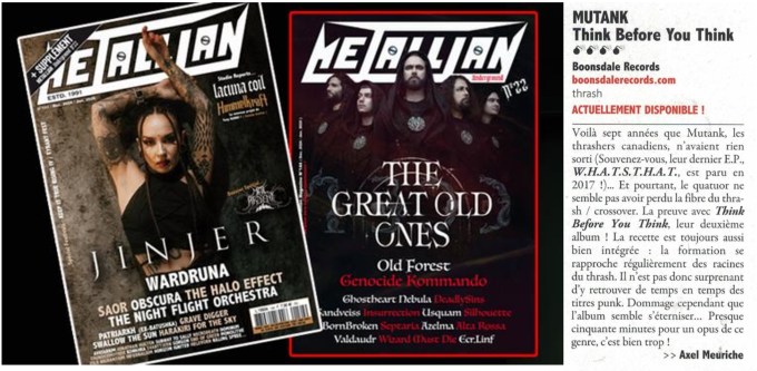 “Mutank have gotten creative with each song on the album, by coming up acronyms to fit the title of the album, they describe their sound as a “T-rex skateboarding down a volcano”. If your a fan of old school Overkill, Megadeath or Exodus or if you just want a fast and thrash album check it out” – Canadian Beats