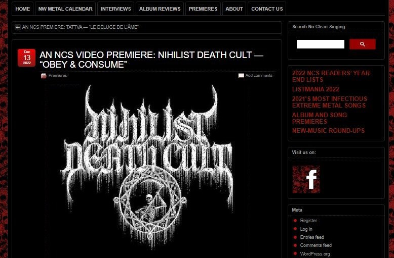 0 NoCleanSinging Premiere – NIHILIST DEATH CULT’s (members ex-Pestilence, Abyss, Tribe of Pazuzu, Soulstorm) Release Video For “Obey & Consume” Off Debut “Death To All Tyrants”