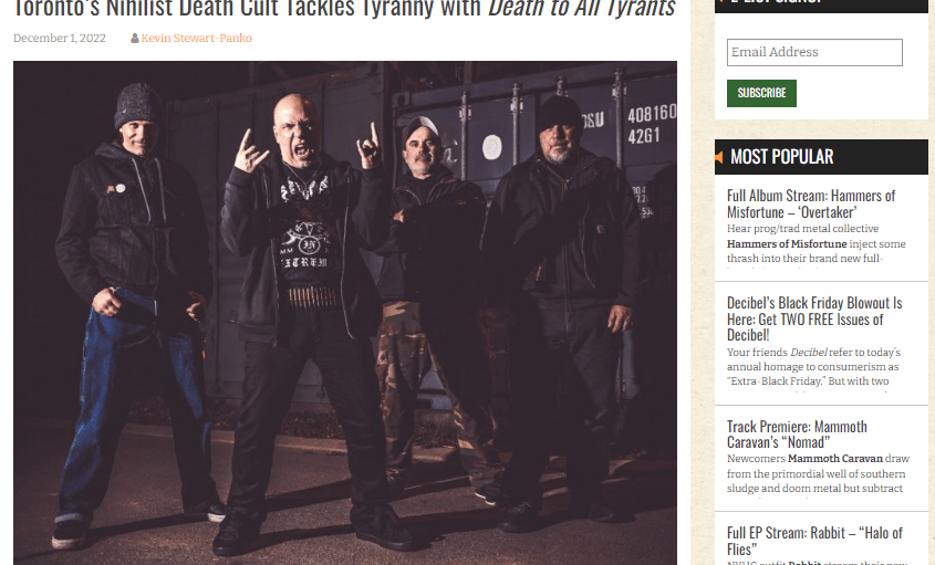 “From one cult to another. This band of punk/death/grinders hail from Toronto and with their 2022 offering Death to All Tyrants, have quickly made an impact on the scene. The album is nine tracks of mini-car crashes. Short, one minute bursts of violence that contain hooks and solos while not sounding forced or generic – hard to achieve but this cult has the formula, perhaps learned in one of those Eyes Wide Shut parties.” – Metal Sucks – 11 Extreme Canadian Bands You Might Not Know