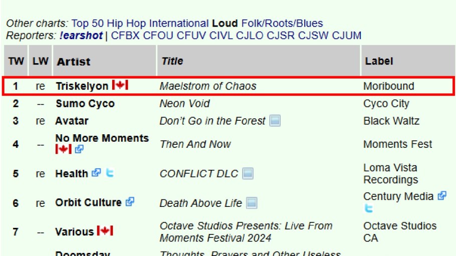 0 Thank You Canadian MDs and DJs for the airplay love to kick off 2026 \m/\m/ For the Week Ending: Tuesday, January 13, 2026 !earshot – The National Loud Chart #3 Juliet Ruin, #8 Triskelyon – Moribund Records https://earshot-online.com/charts/index.cfm?intChartTypeID=106&dWeekOfID=2026-01-13 ================ CIVL Radio 101.7 FM – Abbotsford Loud – #1 Juliet Ruin, #2 Triskelyon, #10 Phaeton https://earshot-online.com/charts/civl.cfm?intChartTypeID=6&dWeekOfID=2026-01-13 Top 30 – #10 Juliet Ruin, #12 Triskelyon https://earshot-online.com/charts/civl.cfm?dWeekOfID=2026-01-13 ================ CJLO – 1690AM – Montreal Loud – #5 Discovery Through Torment https://earshot-online.com/charts/cjlo.cfm?intChartTypeID=6&dWeekOfID=2026-01-13 ================ CJSR FM 88.5 – Edmonton Loud – #2 Juliet Ruin, #3 Merfolk, #4 Devolver, #5 Unpunished https://earshot-online.com/charts/cjsr.cfm?intChartTypeID=6&dWeekOfID=2026-01-13 ================ CJSW Radio 90.9 FM – Calgary Loud – #6 KARU – Rockshots Records https://earshot-online.com/charts/cjsw.cfm?intChartTypeID=6&dWeekOfID=2026-01-13 Top 30 – #28 Ivy Gardens https://earshot-online.com/charts/cjsw.cfm?dWeekOfID=2026-01-13 ================ UMFM 101.5 FM – Winnipeg Loud – #8 Triskelyon https://earshot-online.com/charts/cjum.cfm?intChartTypeID=6&dWeekOfID=2026-01-13 ================