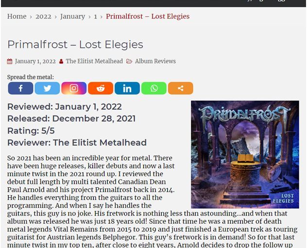 0 Metal-Rules – Primalfrost – Lost Elegies – “I knew that when Arnold dropped another Primalfrost album it would be huge but I did not expect this. LOST ELEGIES took the best ideas of the debut, added some matured songwriting along with almost eight years to master his fretwork to create an absolute masterpiece. I can’t recommend this album enough! 5/5”