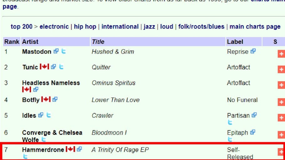 0 \m/\m/ Thank You MDs and DJs for the airplay love! \m/\m/ Canadian College Radio Loud Charts! Lucky 7s ==== January 2022 Top 20 Loud – #7 Hammerdrone ==== !earshot – The National Loud Chart For the Week Ending: Tuesday, February 1, 2022 #7 Primalfrost
