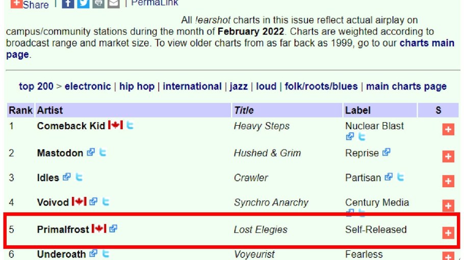 Thank You Canadian MDs and DJs for the airplay love! \m/\m/ !earshot -Top February 2022 – top 20 loud #5 Primalfrost – Lost Elegies https://earshot-online.com/charts/2022/February/loud.cfm