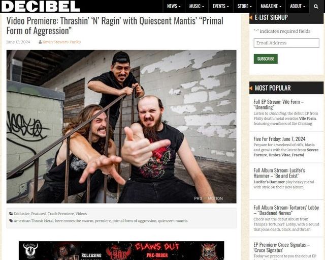“Loaded with battle vests, beer, baldness and breakdowns, Quiescent Mantis have delivered a highly entertaining four minutes into the conversation (Primal Aggression Music Video).” – Decibel Magazine