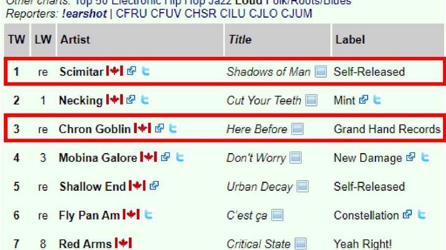 Scimitar Debut #5 and Kosm back at #7 on Canadian College Radio National Loud Charts!
