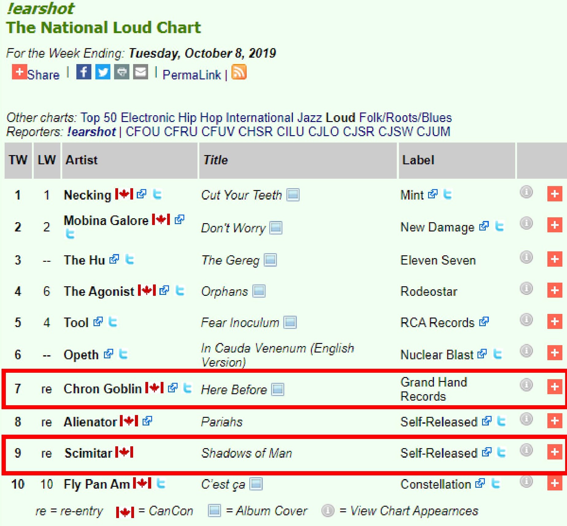 0 Thank You MDs and DJs for all the airplay love! \m/\m/ #7 Chron Goblin, #9 Scimitar !earshot – The National Loud Chart For the Week Ending: Tuesday, October 8, 2019