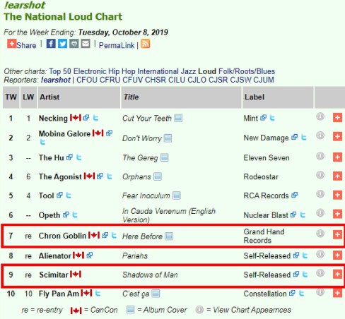 0 and the !earshot – October 2019 – Top 20 Loud Chart is in… Thank You MDs and DJs for all your airplay support \m/\m/ #4 Scimitar #6 Chron Goblin