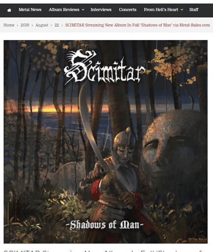 “More reasons to love Canada! From Victoria, B.C. we have Scimitar and their latest album is Shadows of Man. A fusion of styles awaits you as they invite the listener to join them in an epic journey of times long ago. They make a solid and inviting sound that incorporates elements of melodic death metal, black metal,and folk metal to contrast with and complement the heavy riffs, powerful drumming, and Viking style vocals.” – Boston Rock Radio
