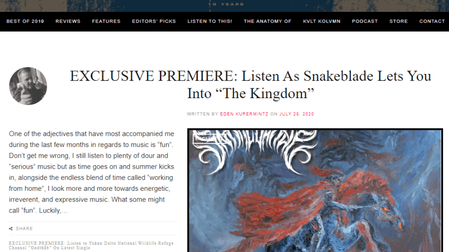 “I am compelled to say that SNAKEBLADE most definitely delivered an utmost maddening, but enjoyably entertaining discovery that made me replay this …pretty much all day long. “The Kingdom” is an addicting spin that will blow brains & shatter windows with explosive clarity. Full of density, technical prowess & engaging captivation. This is an incredibly amazing debut album, and I will most look forward to their upcoming projects. And for a singular writing attempt, bravo! I couldn’t help but score this as a masterful piece of other-worldly malevolence which most certainly deserves a slot in your collection for sure. Check it out!” – Metal Temple