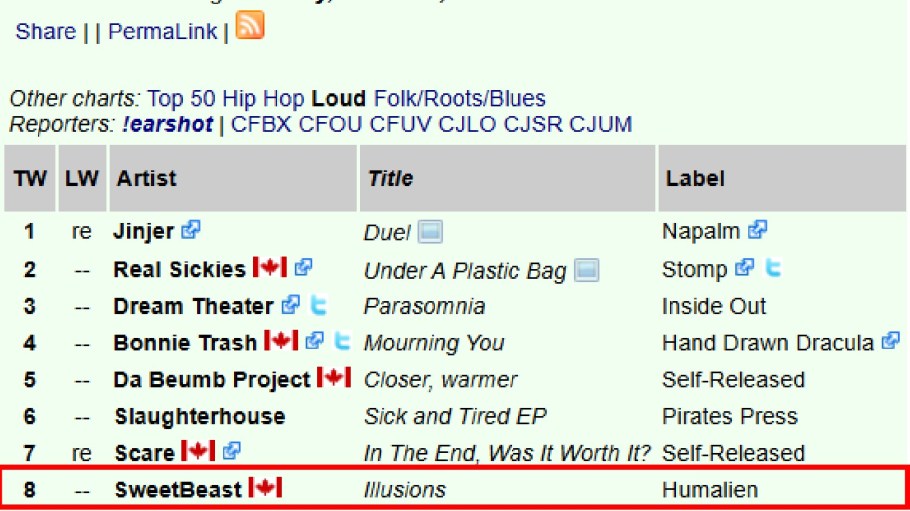 0 Thank You Canadian MDs and DJs for the airplay love \m/\m/ !earshot – The National Loud Chart For the Week Ending: Tuesday, March 25, 2025 #8 SweetBeast – Illusions | 92.5 FM CFBX “the X” – Kamloops – Loud #1 SweetBeast, #9 Forsaken Rite | Smithers Community Radio CICK 93.9 – Smithers – Top 30 #12, #22 CHÜZO