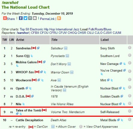 0 Thank You MDs and DJs for supporting Canadian Death Metal! \m/\m/ #3 Tales of the Tomb, #9 Third Chamber !earshot The National Loud Chart For the Week Ending: Tuesday, December 17, 2019