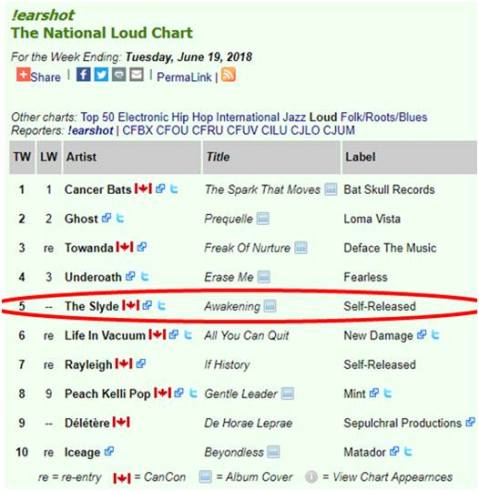 0 Thank you Canadian MDs and DJs! \m/\m/ The Slyde – “Awakening” #5 on !earshot The National Loud Chart For the Week Ending: Tuesday, June 19, 2018