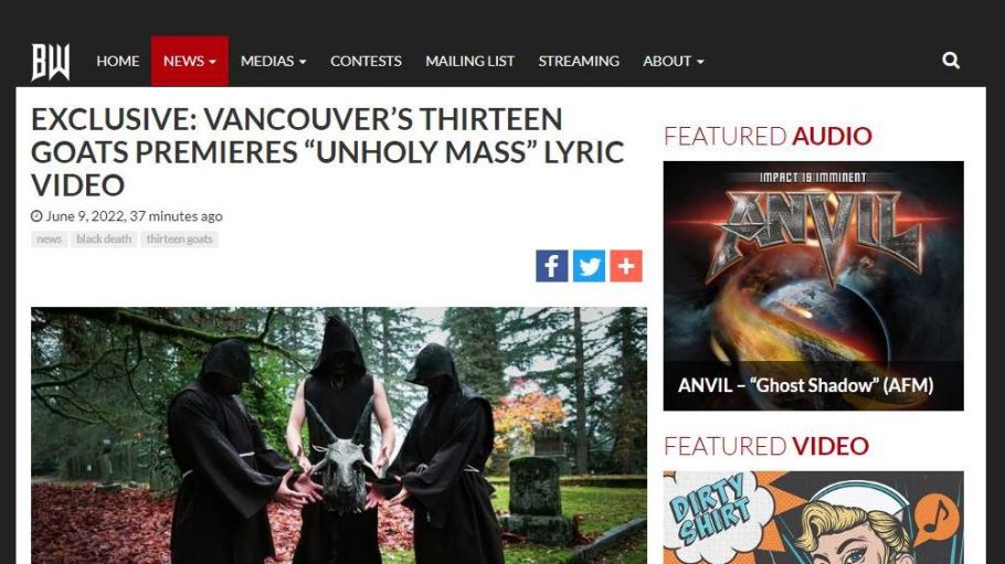 “Vancouver’s Thirteen Goats is now streaming their new single “Servant Of The Outer Dark.” The single perfectly marries old school death metal, blackened tendencies, and heavy metal choruses all into one killer song. Plus the video directed by Nessa Aref and Alysson Hall is pretty damn cool.” – Metal Injection