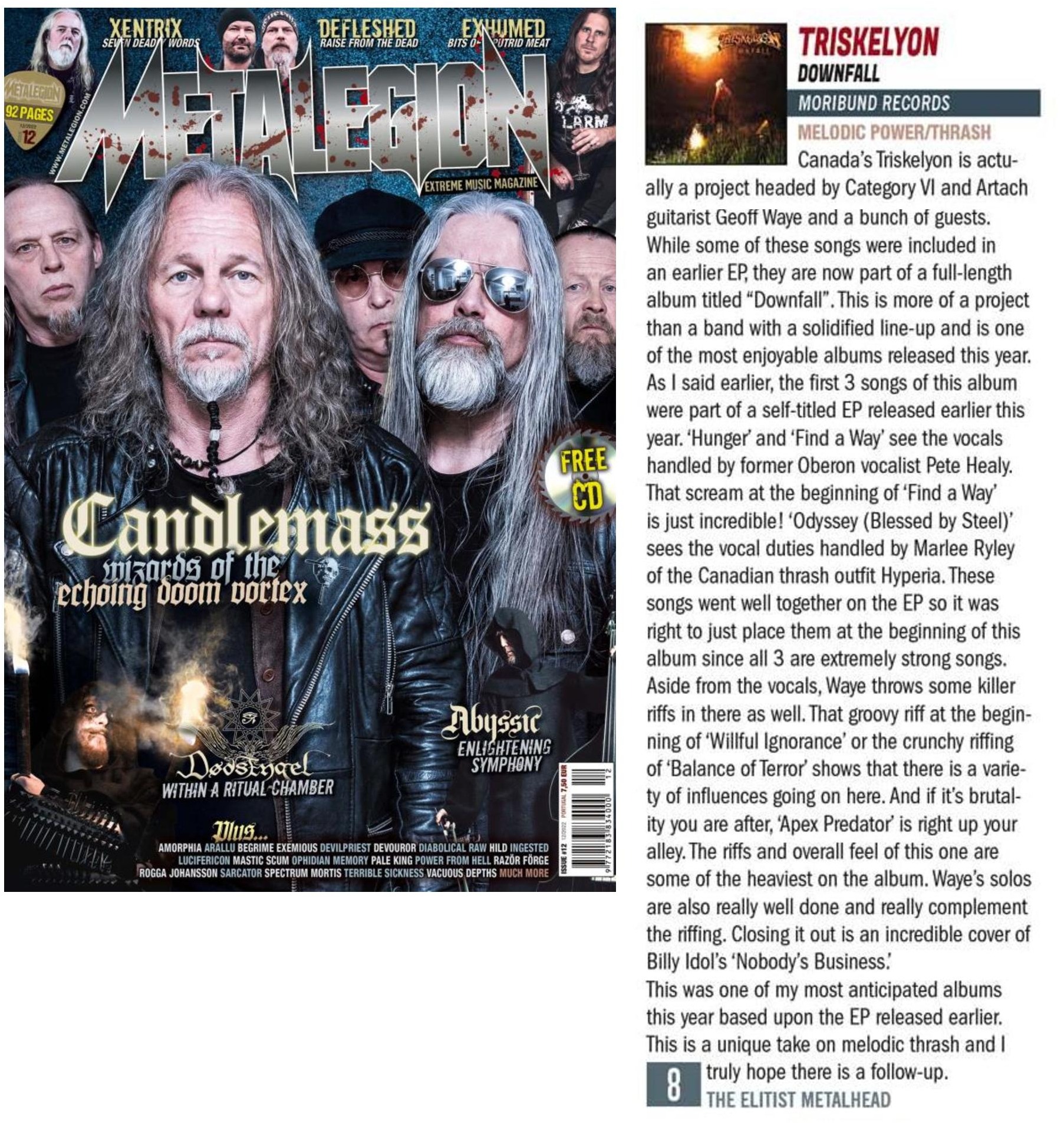 “Most of the songs on here are fast and furious, such as “Balance of Terror” with its Hanneman/King-esque riffing, the skull-piercing “Odyssey (Blessed by Steel)” and the powerful “A Time of War,” though they do slow down a bit on the moody march of “Find a Way” while still remaining heavy as all hell… Triskelyon don’t reinvent the wheel of Power/Thrash, but they sure know how to keep it spinning, and that makes Downfall worth giving a spin of its own.” – The Metal Crypt