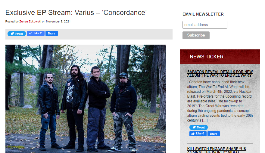 “For their second EP Concordance, Varius decided to let each band member bring their own song in. This move lets the band step away from the rigid melodic death metal of their first EP, The Great Tribulation, and try out other genre types. Opener “Golden Crown” keeps its deathly roots in the ruinous vocals, as the song is otherwise traditional heavy metal that wouldn’t have been out of place for Manowar or Accept. Each of the four tunes on Concordance avoid hinting at any ideas of what Varius will do next, like the forceful doom in the second half of closer “Gut Shoveler.” Hearing their two EPs back-to-back is listening to a band actively transforming themselves over the course of 40 minutes. With Concordance, Varius have made a point to keep their sonic options open moving forward, as they could go anywhere from here. 4/5” – Heavy Music Headquarters