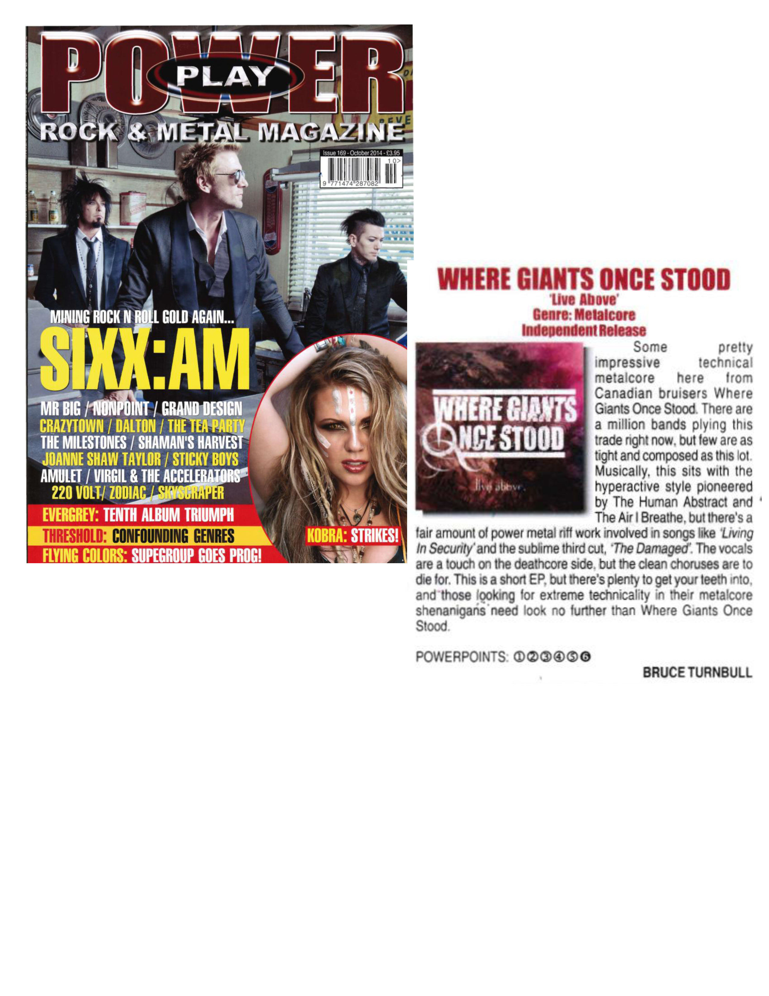 “Live Above is a four-song EP. Where Giants Once Stood doesn’t go into preliminaries: an EP has a short duration and they don’t want to waste any time showing what they’re capable of. “Living in Secrity” immediately catches the attention with its guitar solo à-la-Unearth and its clean vocals à-la-Avenged Sevenfold during the chorus.” – Metal Made In Canada