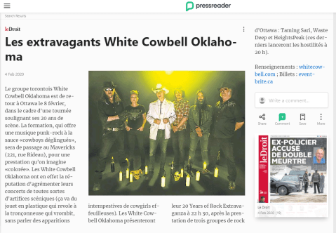There’s no warm-up for White Cowbell Oklahoma’s sixth full-length release, recorded at Zeus’s Toronto studio and also in concert in Amsterdam. As in their live shows, where flames and power tools feature prominently, the underrated Toronto old-school rockers throw us into the fire immediately, and that fire doesn’t die until long after the final chords – from not one, not two, but three guitars – ring out.” – Now Toronto (2015 Mixto Sixto Review)“a fist-pumping, anthemnic set of songs thick on low-end, pelvic thrust and grit. Easily their most confident effort to date, it displays a new Bell that is streamlined and primed for attack. ” – Exclaim! (2009 Bombardero Review)