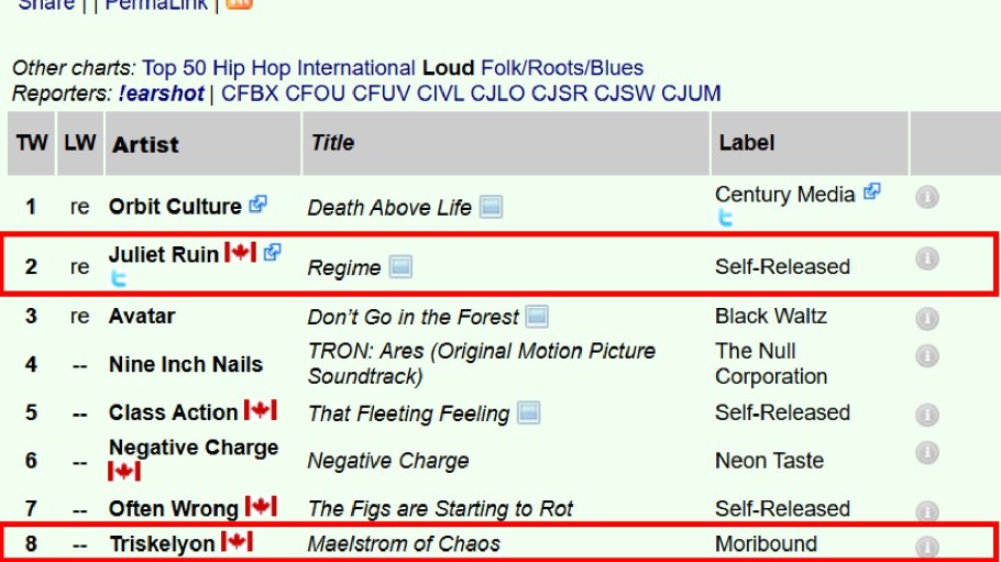 0 Thank You Canadian MDs and DJs for the airplay love! !earshot – The National Loud Chart For the Week Ending: Tuesday, December 16, 2025 #1 Juliet Ruin, #6 Triskelyon – Moribund Records | 92.5 FM CFBX “the X” – Kamloops Loud – #3 Woodhawk, #6 Ivy Gardens | CFUV 101.9 FM – Victoria Loud – #5 Juliet Ruin | CIVL Radio 101.7 FM – Abbotsford Loud – #1 Triskelyon, #3 Juliet Ruin, #9 Phaeton | CJSR FM 88.5 – Edmonton Loud – #6 Juliet Ruin, #8 Devolver, #9 Ancient Thrones | CFBX 92.5FM – Kamloops Top 30 – #20 Merfolk, #30 Woodhawk | CFRU 93.3 FM – Guelph Top 30 – #20 Merfolk | Smithers Community Radio CICK 93.9 – Smithers Top 30 – #15 Z-Cocoon | CIVL 101.7 FM – Abbotsford Top 30 – #9 Triskelyon