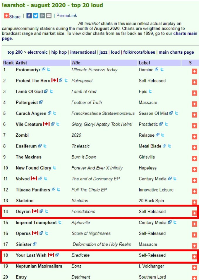 0 Huge Hails Horns! Thank You Canadian MDs and DJs for the airplay love! !earshot – august 2020 – top 20 loud #14 – Osyron #18 – Your Last Wish