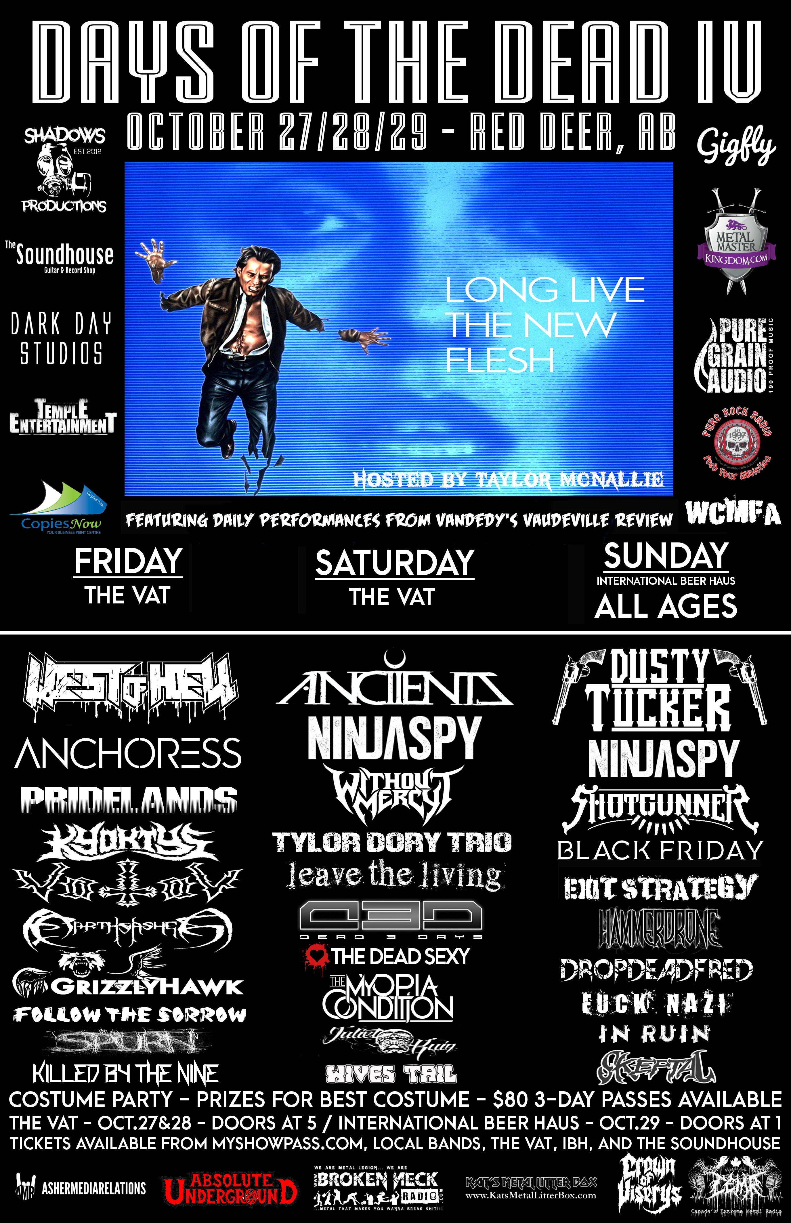 Decimate MetalFest is the brainchild of Sloan Voxx of Voxx Promotions, which is destined to become an annual Canadian metal pilgrimage to Calgary, Alberta, Canada. With the many yearly festivals becoming part of the national metal heritage, Sloan wants Decimate MetalFest to become one of the best-known events alongside the various festivals located within Alberta, and Western Canada. With Voxx Promos booking and promotional experience, and the support of metalheads internationally, there is nothing to stop them from reaching their goal of bringing in the masses and putting on incredible metal festivals for years to come!” (writing credit – Ingrid Newton)